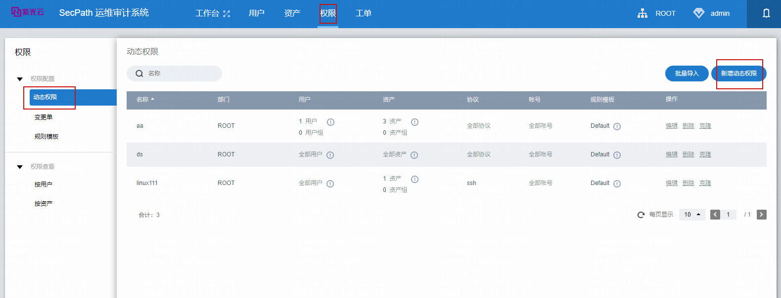 动态权限:在堡垒机系统上直接选择用户、资产、访问账号,形成访问权限。此方法配置快速便捷。