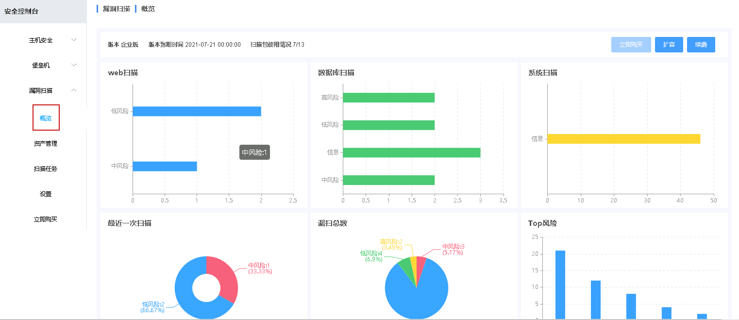 页面上方展示漏洞扫描版本、到期时间、扫描包使用情况。如果需要扩容或续费,您可以单击右侧的“扩容”或“续费”按钮。