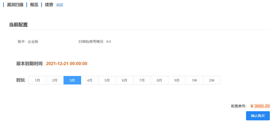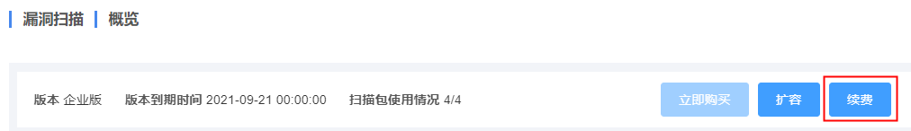 当已购买的漏洞扫描配额包到达使用期限时,将不再继续提供服务。如需继续使用,请续费配额包,以增加漏洞扫描服务的使用时长。