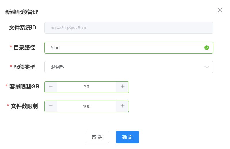 限制型会对目录进行容量限制。需输入需要限制的容量和文件数。输入的容量及文件数只能小于父目录配额大小,并且需要大于子目录配额大小。