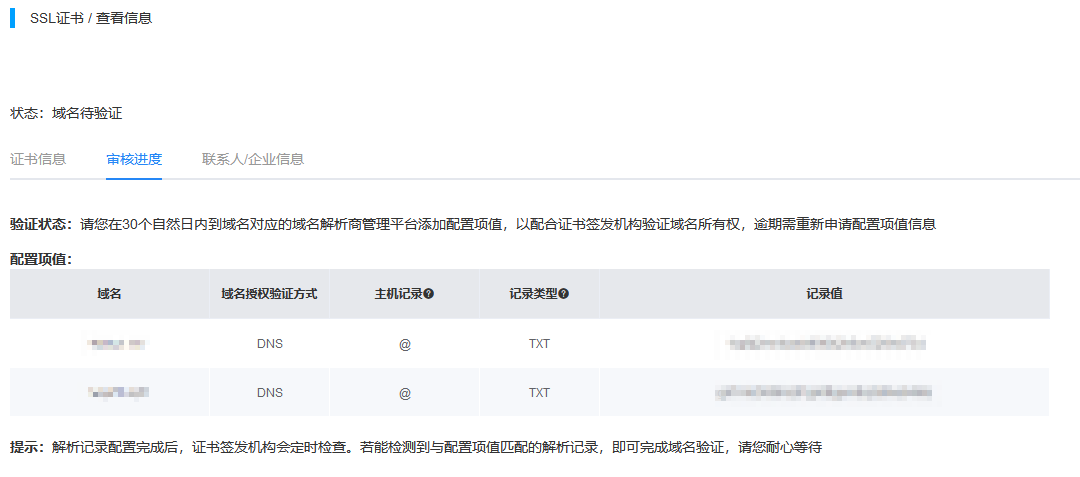 解析记录配置完成后,证书签发机构会定时检查。若能检测到与配置项值匹配的解析记录,即可完成域名验证,请您耐心等待。