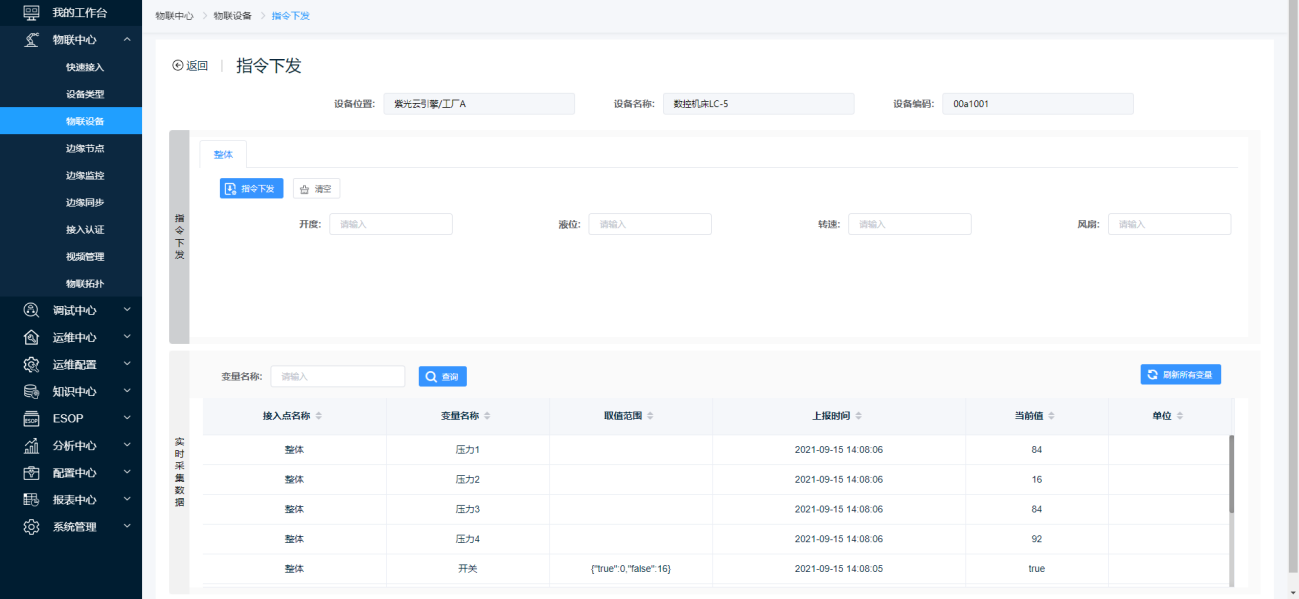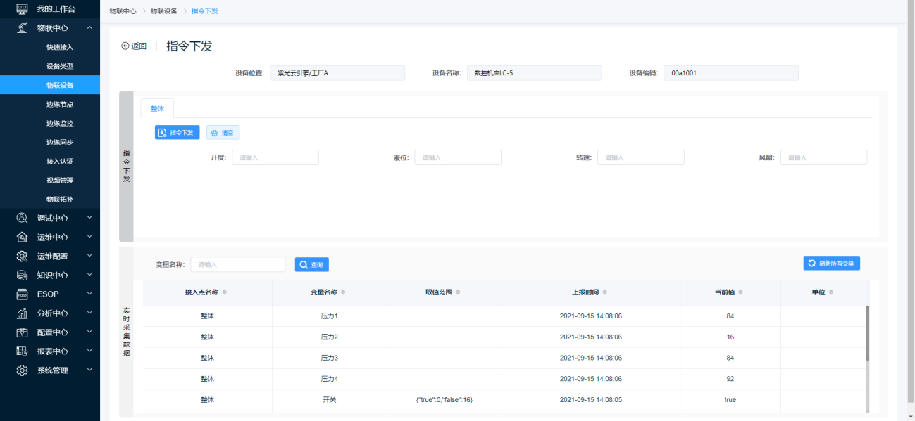 第二步:输入需要下发的指标点击【指令下发】,指令下发成功,实时采集数据同步更新。