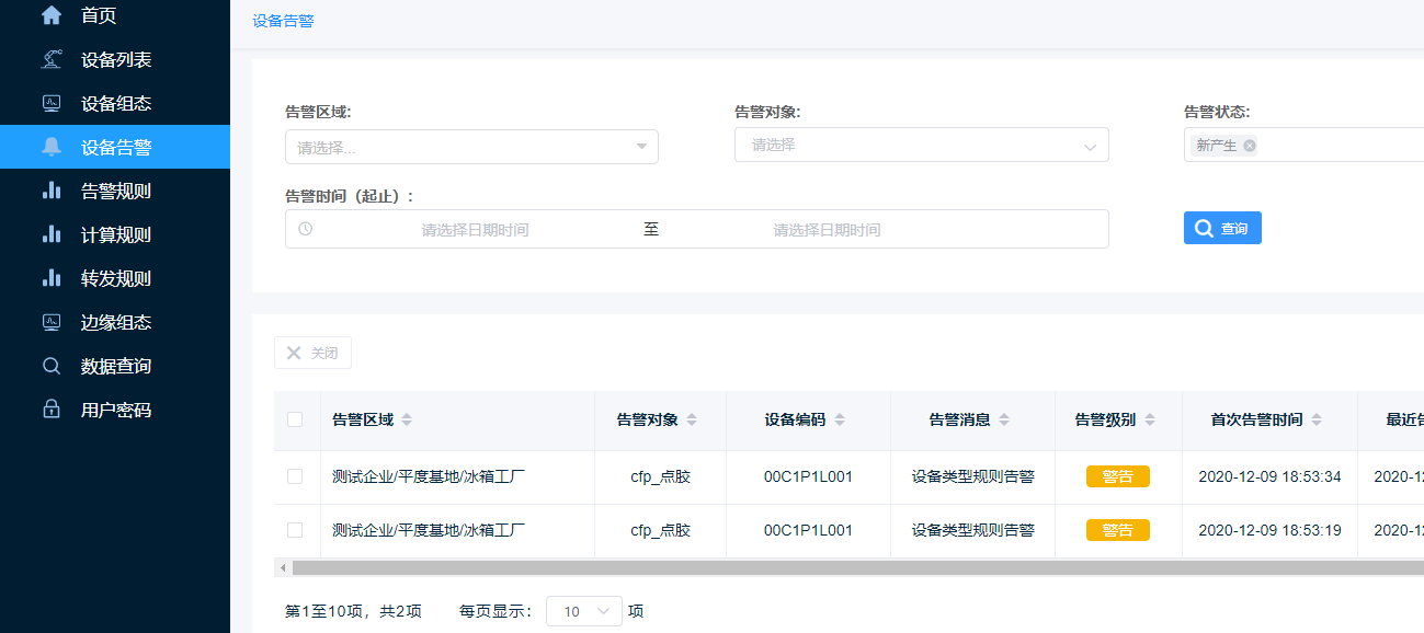 用户能够查看设备产生的告警,能够根据条件查询告警,;对告警执行【关闭】操作,关闭告警。关闭告警时会同步该信息到云端;