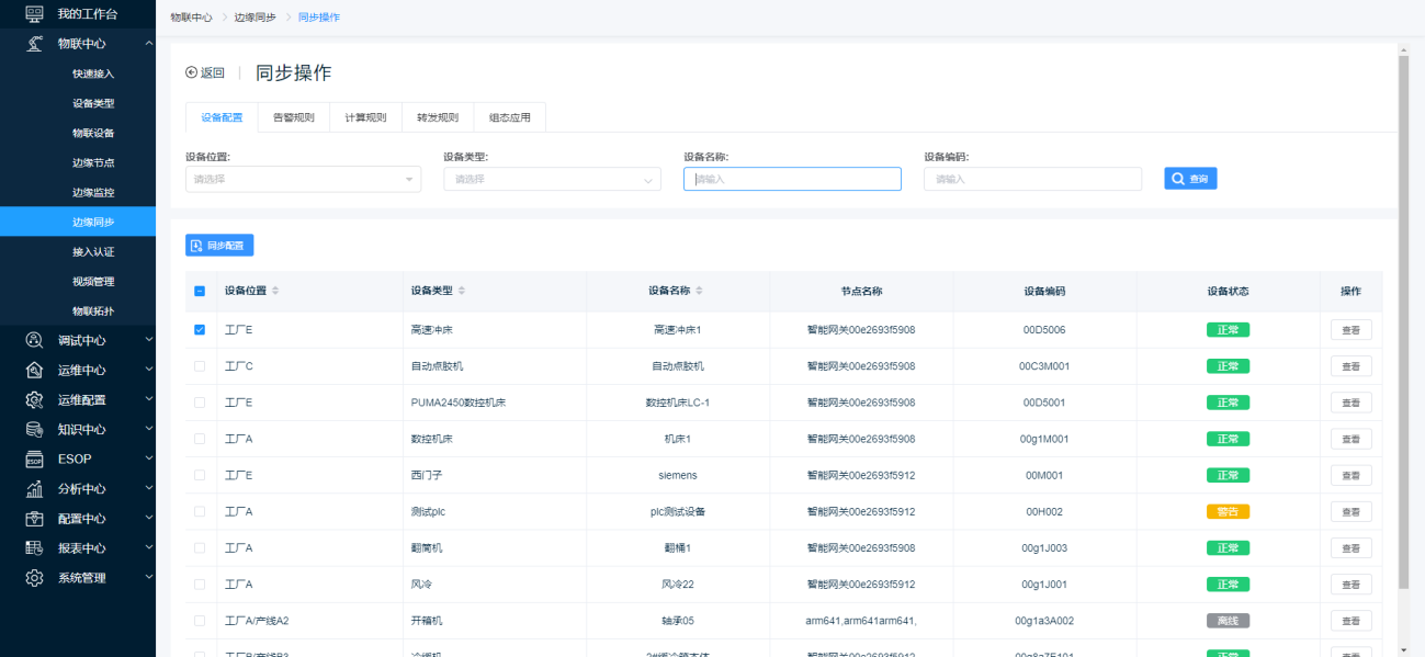 选中需下发的设备点击【同步配置】将该设备信息下发到对应的边缘端。配置下发日志页面可查看下发状态,状态为“成功”,则说明已经同步到边缘端设备列表。