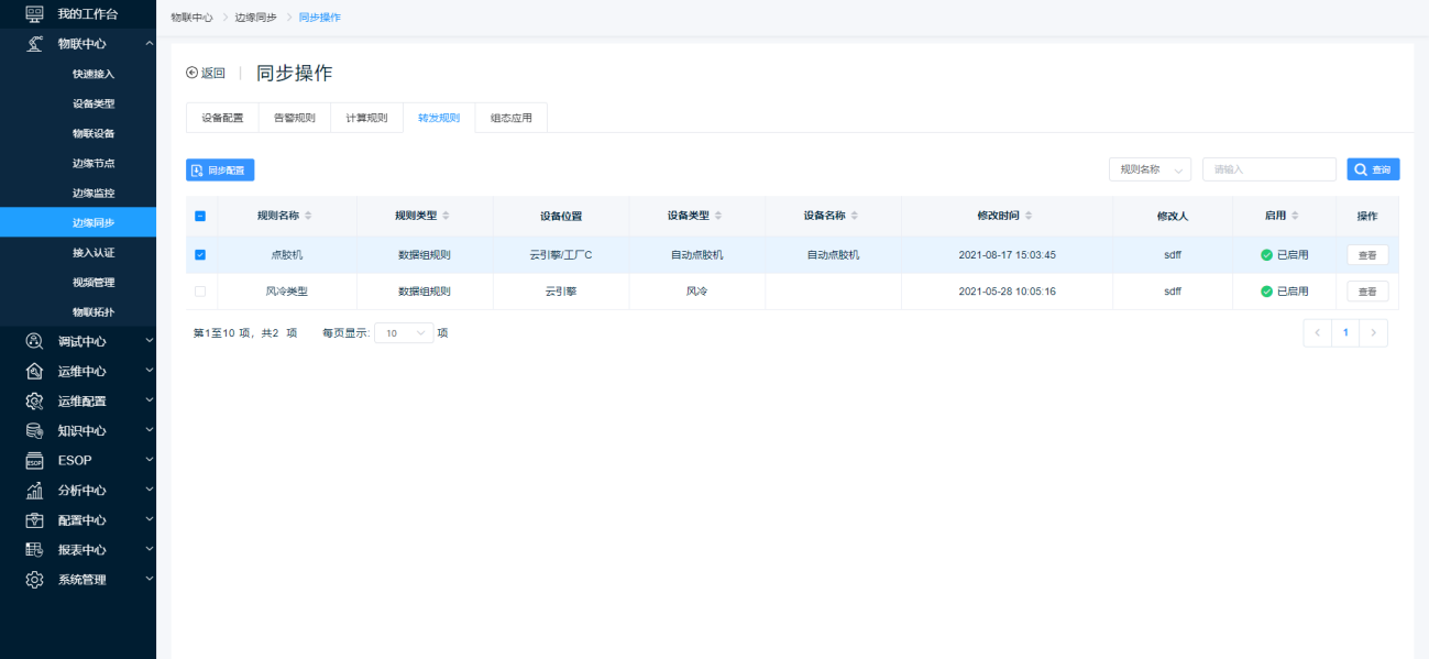 选中需下发的规则点击【同步配置】将该规则发到对应的边缘端。配置下发日志页面可查看下发状态,状态为“成功”,则说明已经同步到边缘端转发规则。