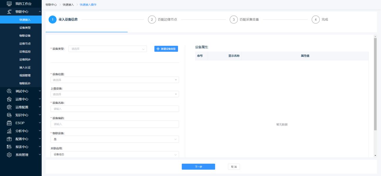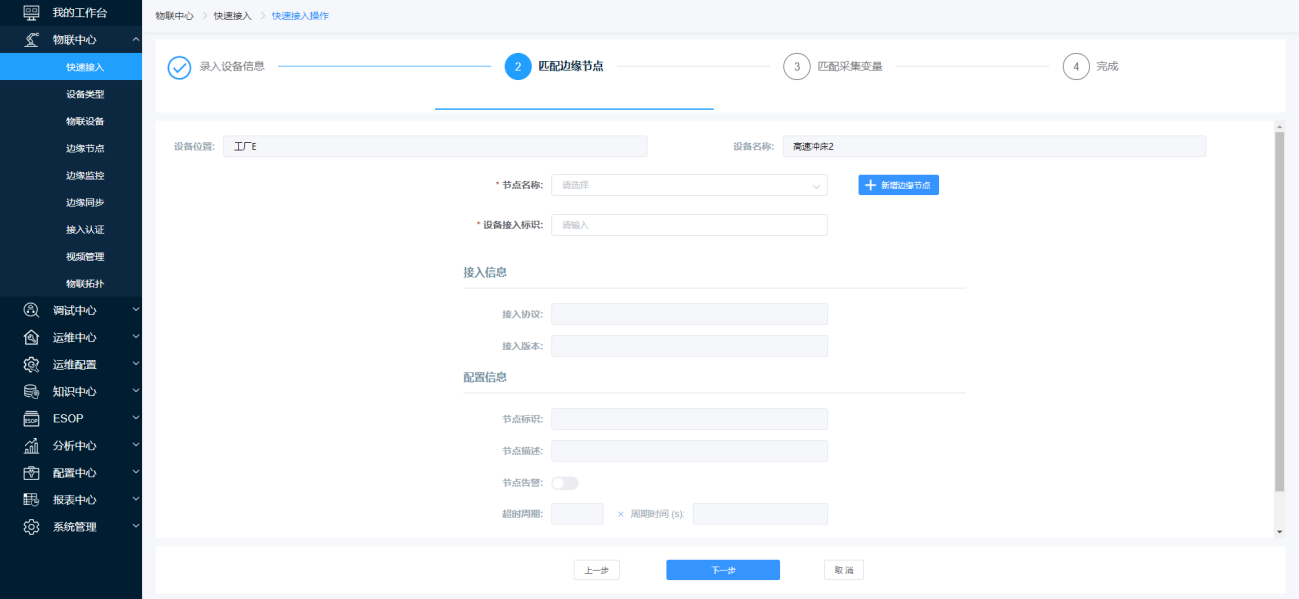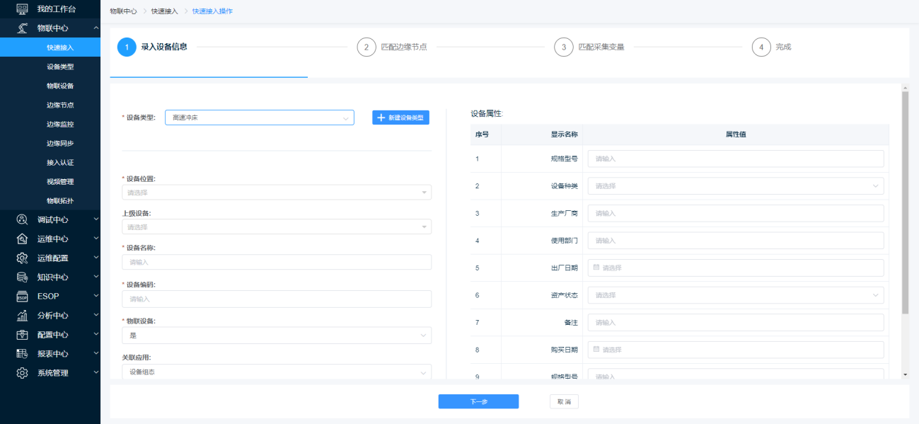 第二步:在【录入设备信息页面】页面中录入“设备类型”、“设备位置”、 “设备名称”、“设备编码”、“物联设备”后点击【下一步】按钮完成设备信息录入跳转至【匹配边缘实例】页面。