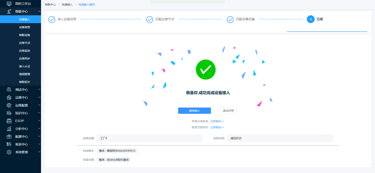 第五步:在【完成】页面中点击【确定】,完成设备的快速接入,【继续接入】页面跳转至新的【设备快速连接新设备】页面,点击【退出向导】页面跳转至【快速接入】列表页面,点击【前往查看设备数据】页面跳转至设备的【数据监测】页面,点击【前往配置告警规则】页面跳转至【添加设备告警规则】页面。