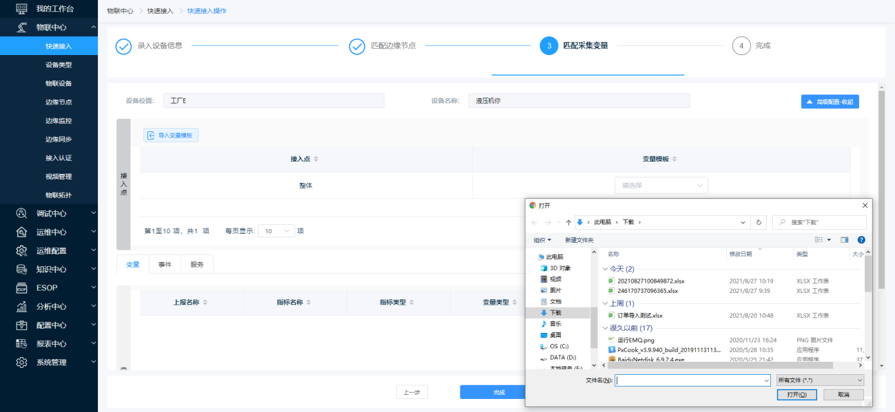 若缺少关联设备的采集变量,点击【高级配置-展开】下的【导入变量模版】按钮,弹出窗口页面,进行变量模板的添加。