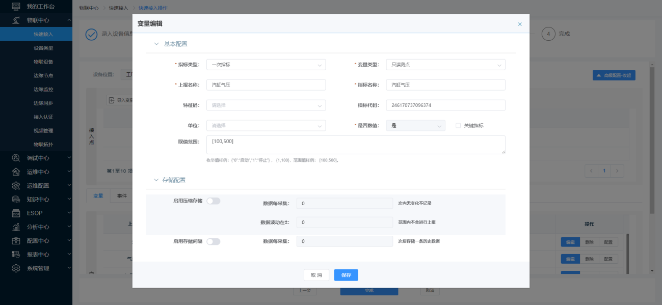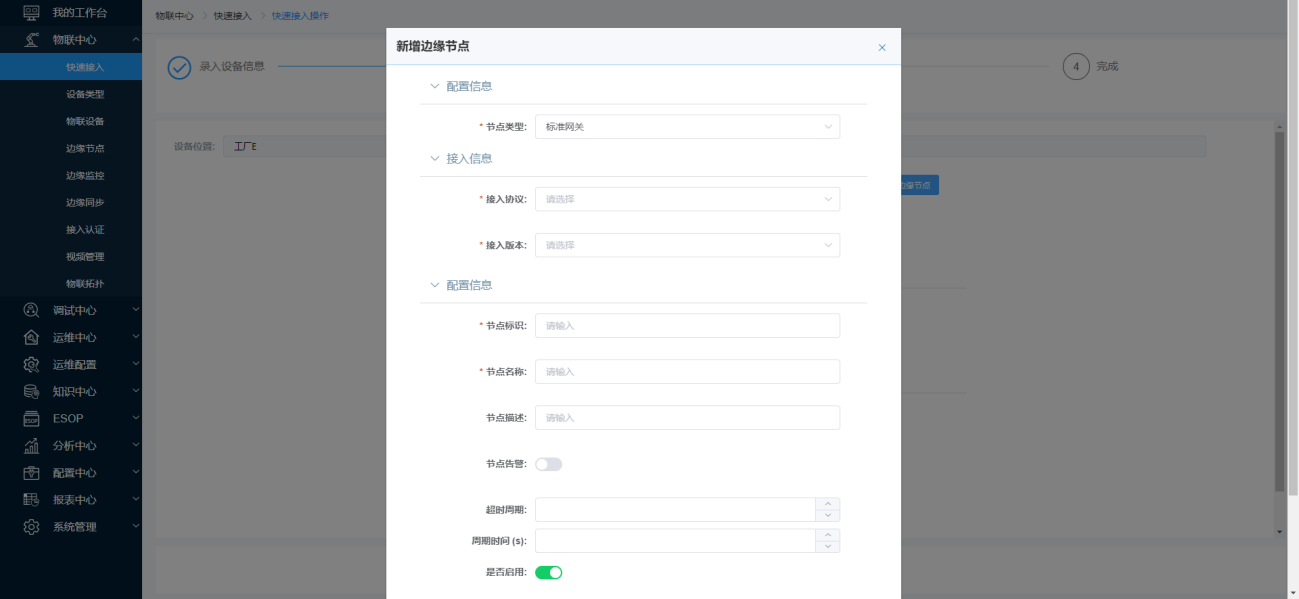 快速接入为设备接入相关功能模块的整合,通过建立快速连接向导,实现设备配置信息快速录入平台,完成设备的配置。支持对连接向导进行添加、编辑、删除操作。