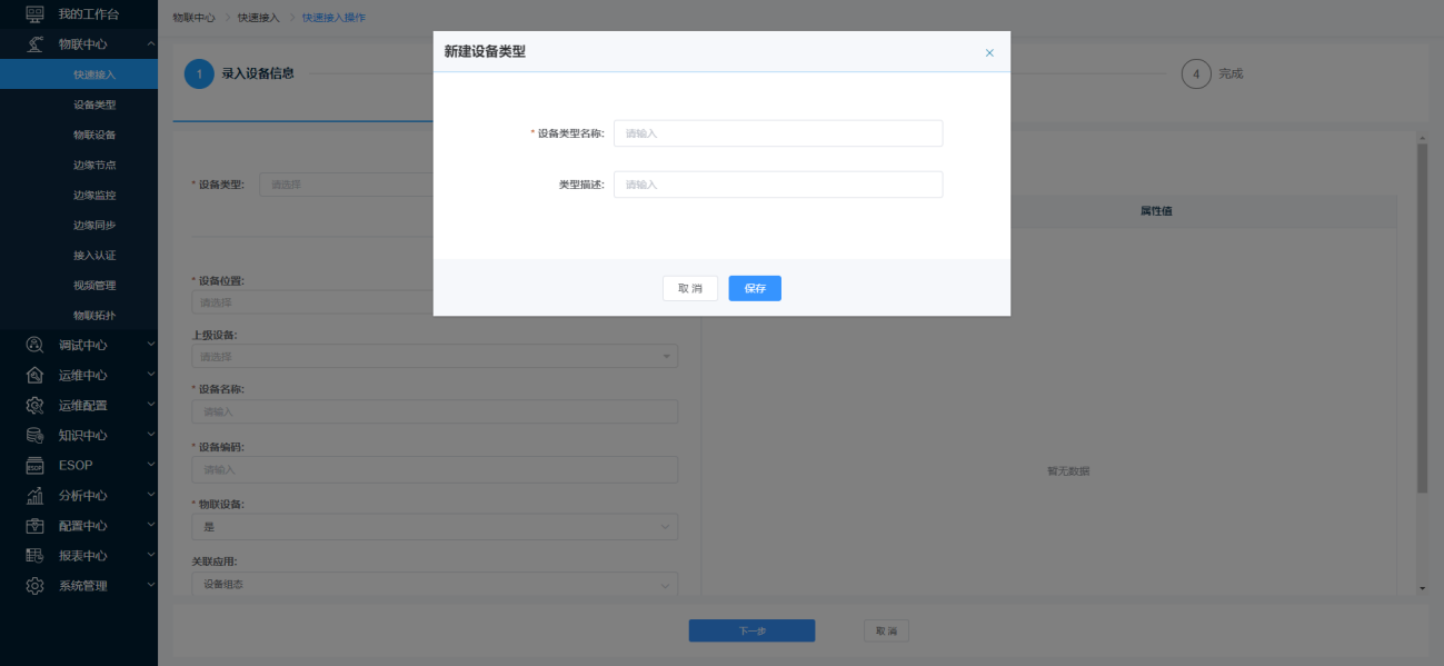 若缺少接入设备的设备类型,点击【新增设备类型】按钮,弹出【新建设备类型】窗口页面,进行设备类型的添加。
