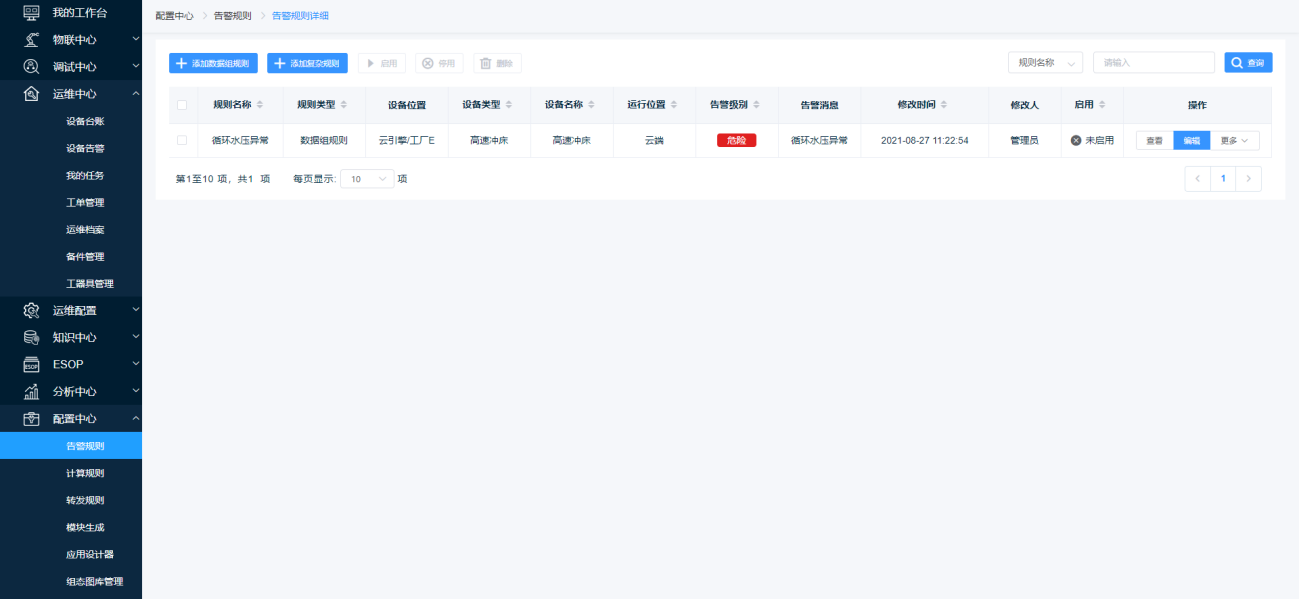 点击【查看告警规则】按钮,跳转至【告警规则】页面,可以查看当前设备已制定的告警规则。