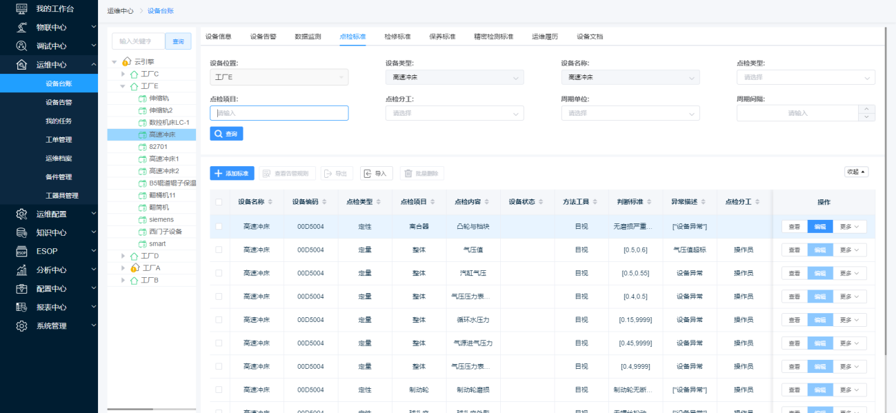 用户能够在指定的设备进行点检标准的添加、导入、导出,对已添加的点检标准进行管理操作,根据点检计划标准进行数据查询,进行编辑、复制、删除等操作。
