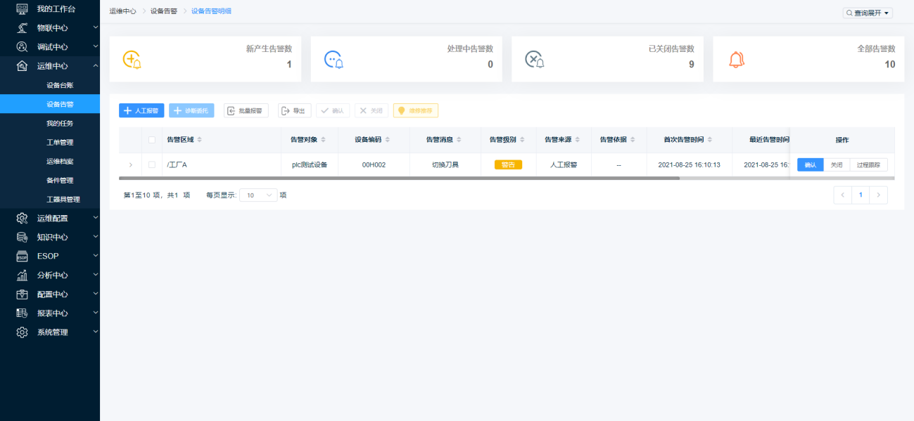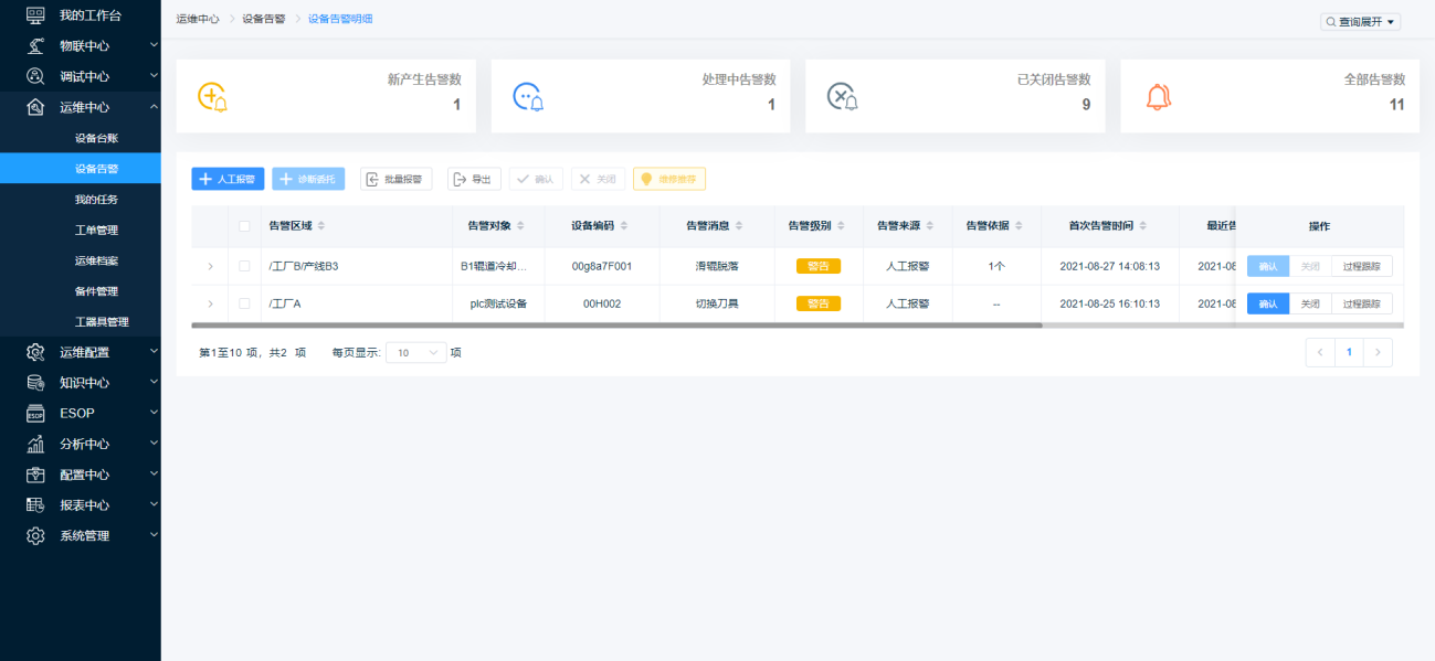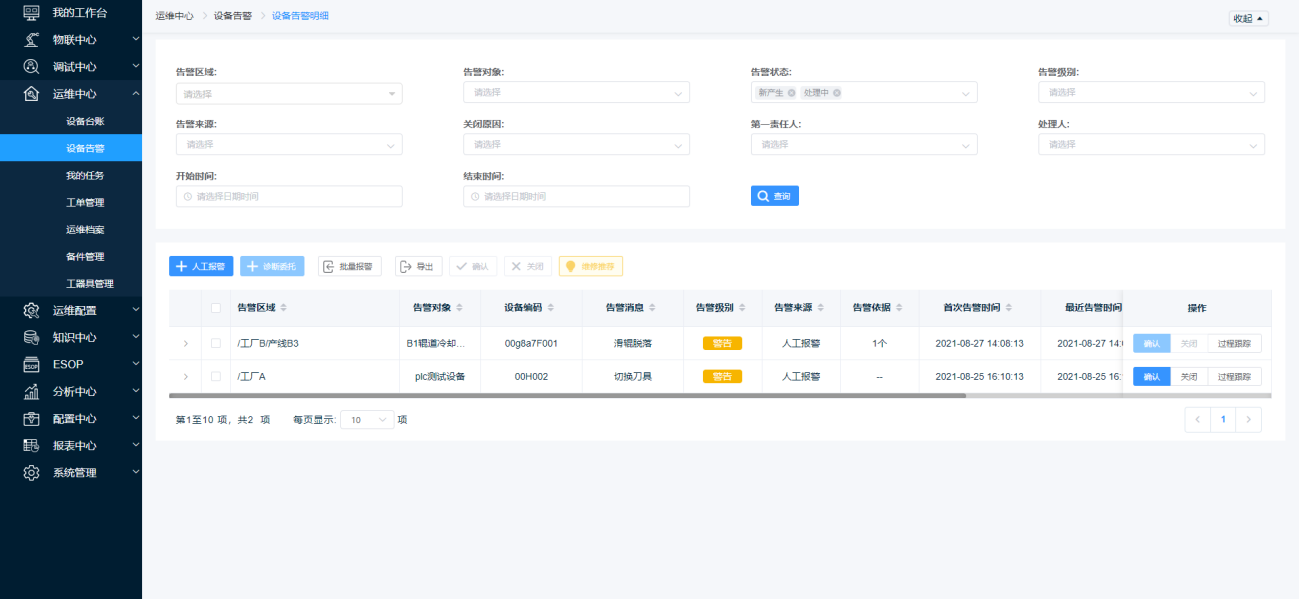 用户能够查看设备产生的告警,能够根据条件查询告警,对告警进行处理,对告警执行【确认】操作,告警转工单进处理流程;对告警执行【关闭】操作,关闭告警。能够主动发起人工报警,发起诊断委托。