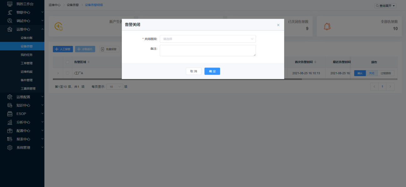选择需要删除的告警点击【关闭】按钮在弹出的【告警关闭】窗口页面,输入“关闭原因”点击【确定】按钮,关闭告警。