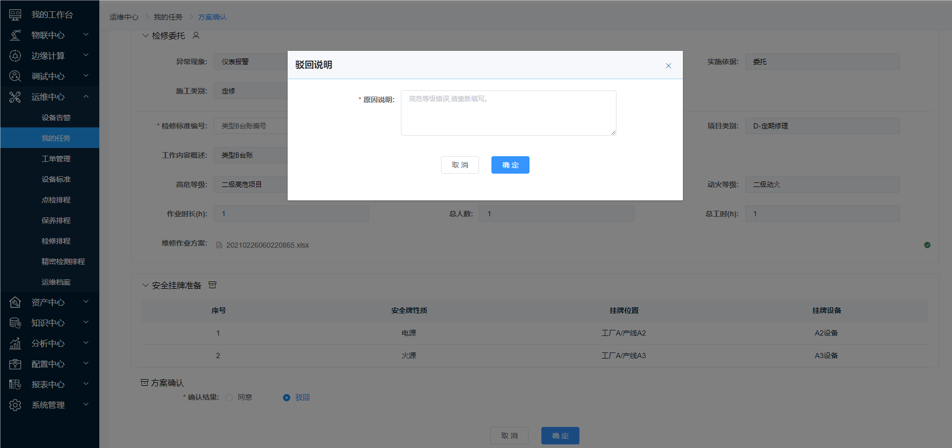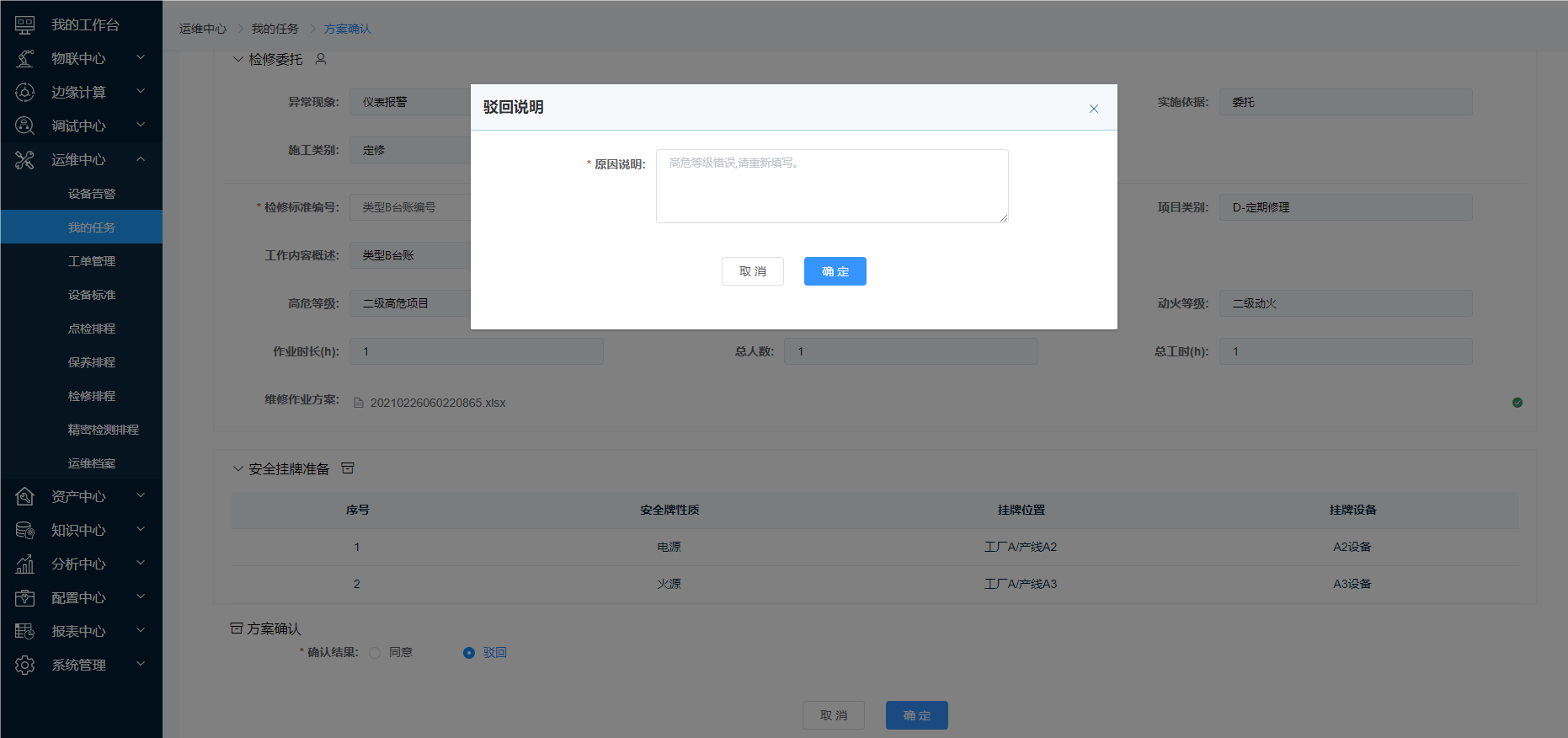 1. 选择方案确认为驳回,在弹出窗口输入原因说明,点击【确定】按钮操作完成,工单节点变为“退回处理”。