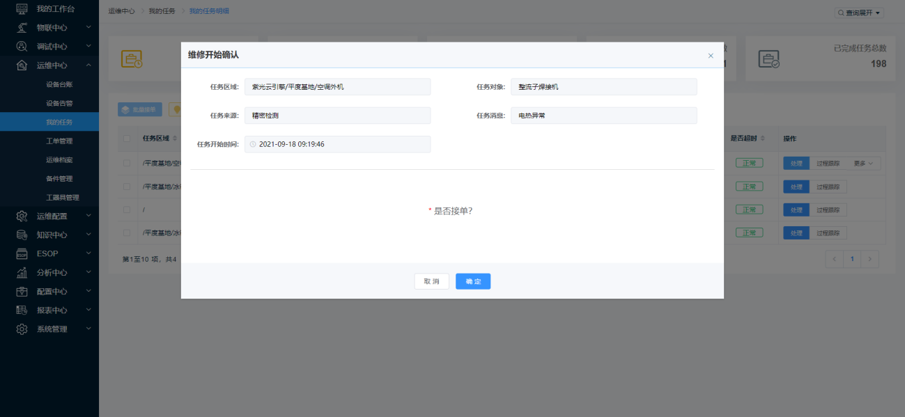 第一步:选择当前处理任务节点为“接单”的精密检测任务点击【处理】按钮弹出接单确认窗口页面,点击【确定】按钮完成任务接单。
