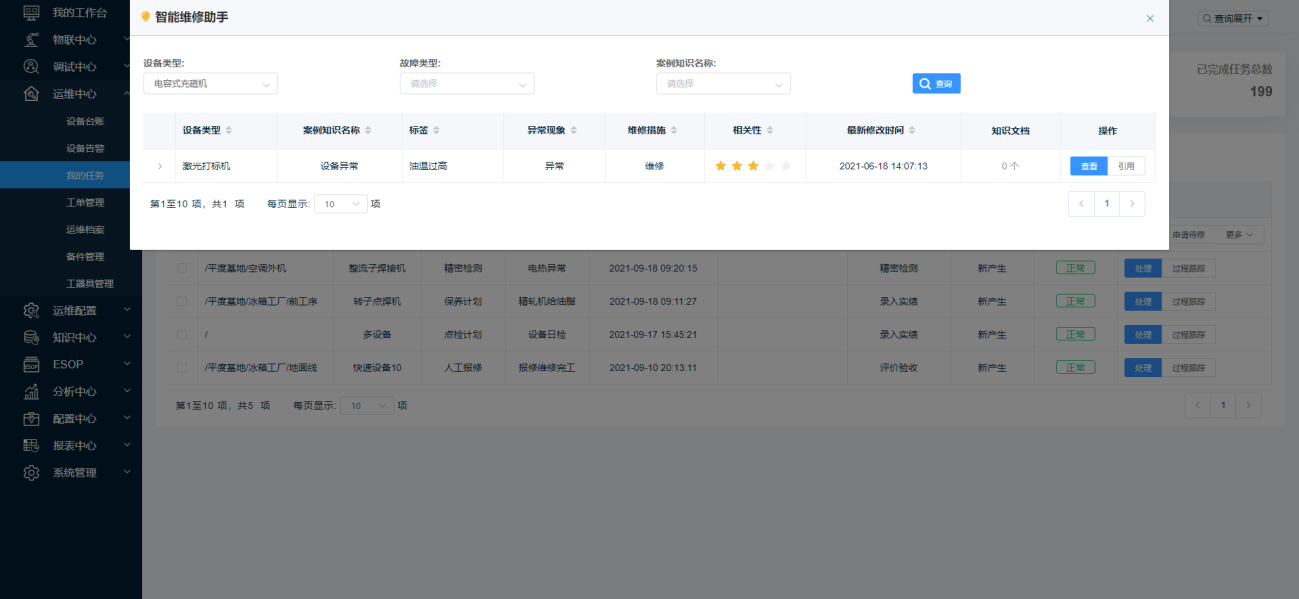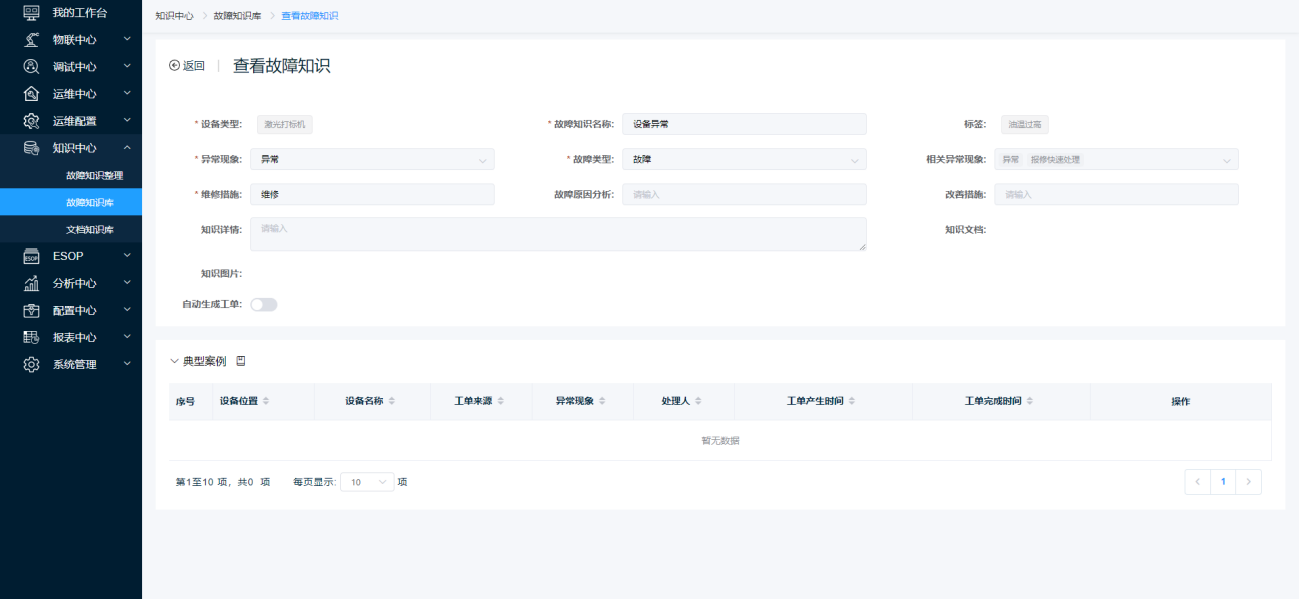 第一步:选择对应的告警设备点击维修推荐,选择对应的故障类型点击【查看】跳转到案例知识查看能看到对应的维修案例档案详情。