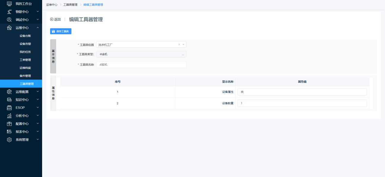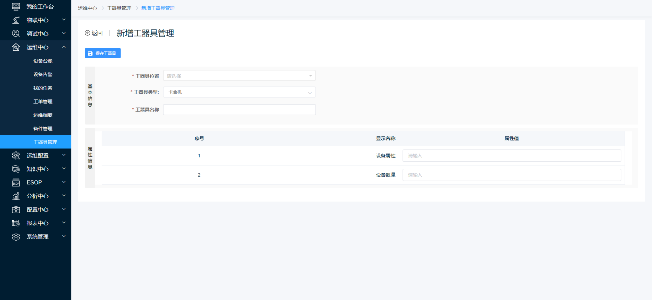 第一步:点击添加工器具记录,输入基本信息,属性信息点击【保存工器具】显示保存类型信息成功。