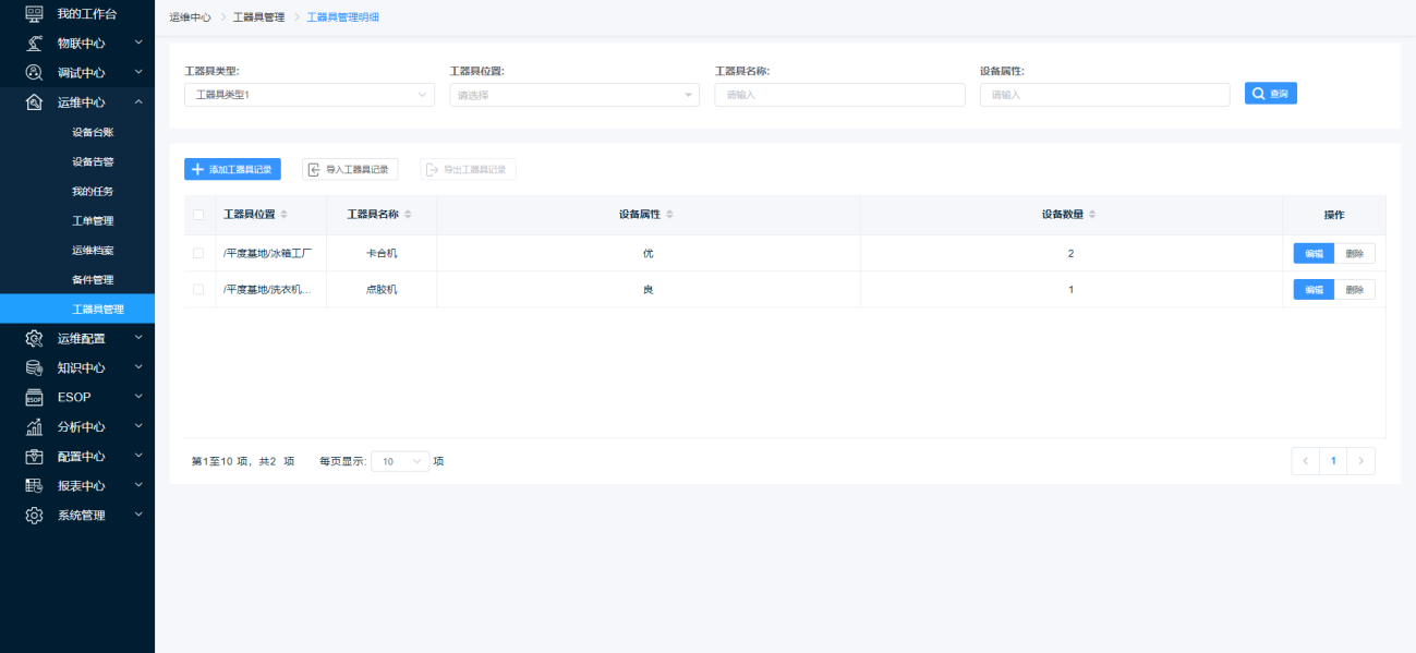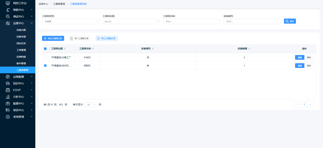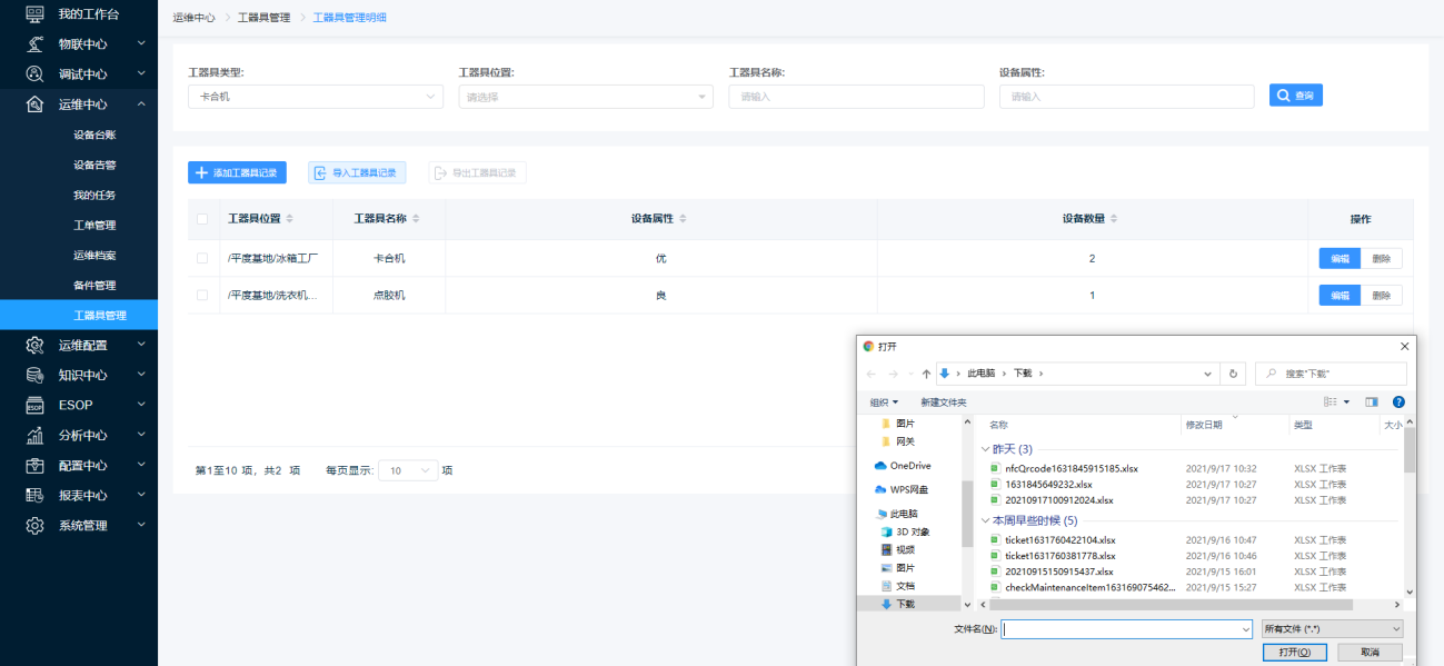 建立非设备基本资料库、全面管理设备的编码、分类、归属、位置、责任人、资产状态等信息,非设备查询工器具类型,支持工器具记录导入导出,添加工器具记录。