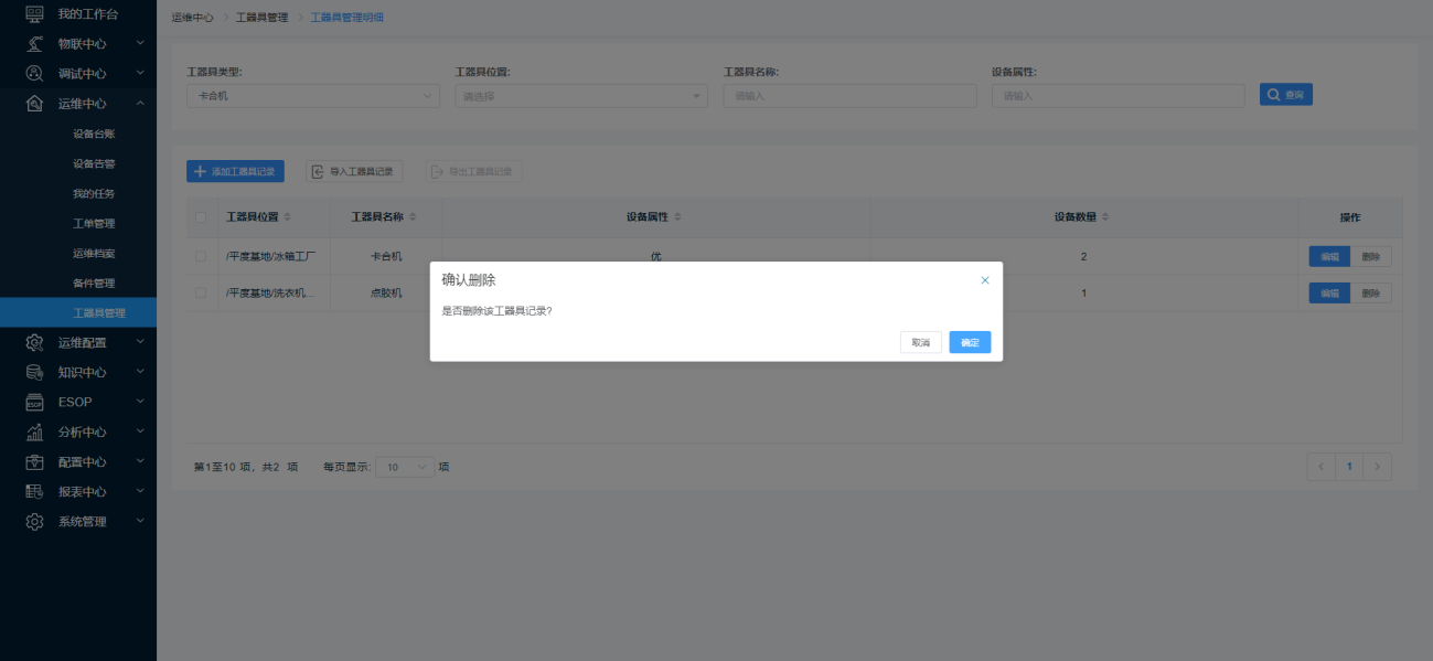 第一步:选择需要删除的工器具记录点击【删除】按钮打开提示窗口页面。点击【确认】按钮完成工器具记录删除。