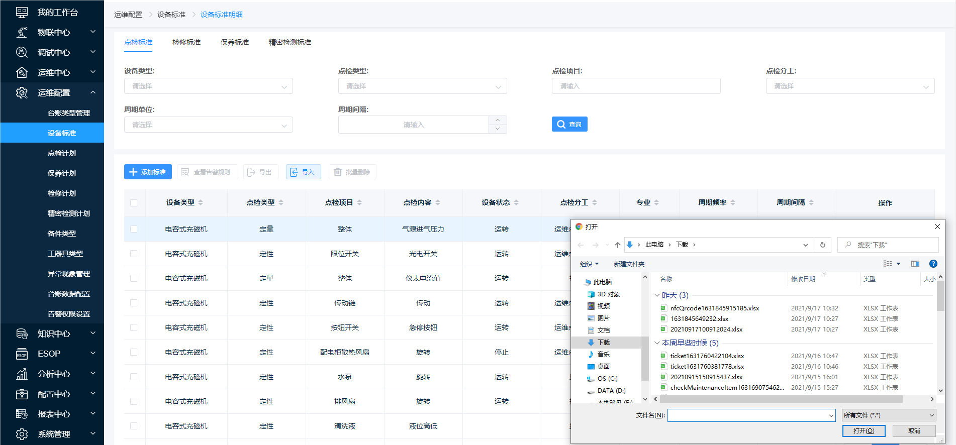 用户能够对选择指定的设备类型进行点检标准的添加、导入、导出,对已添加的点检标准进行管理操作,进行数据查询、编辑、复制、删除的操作。