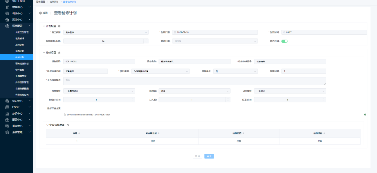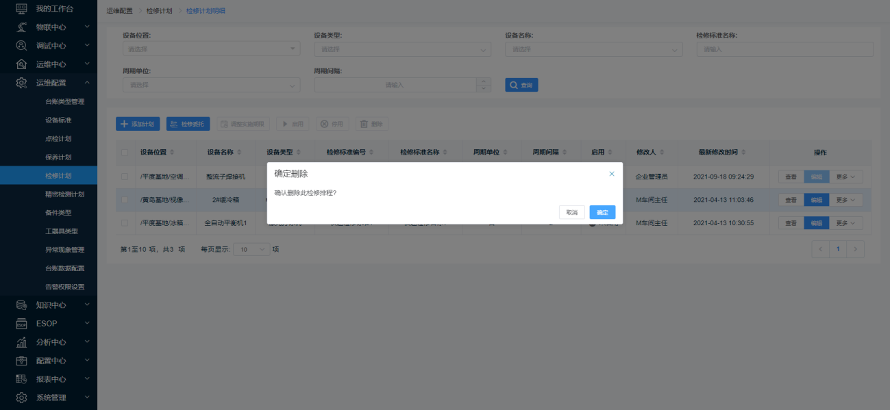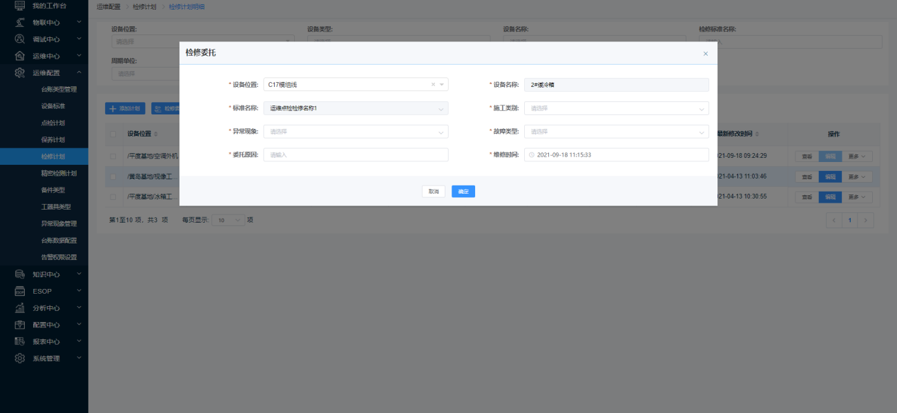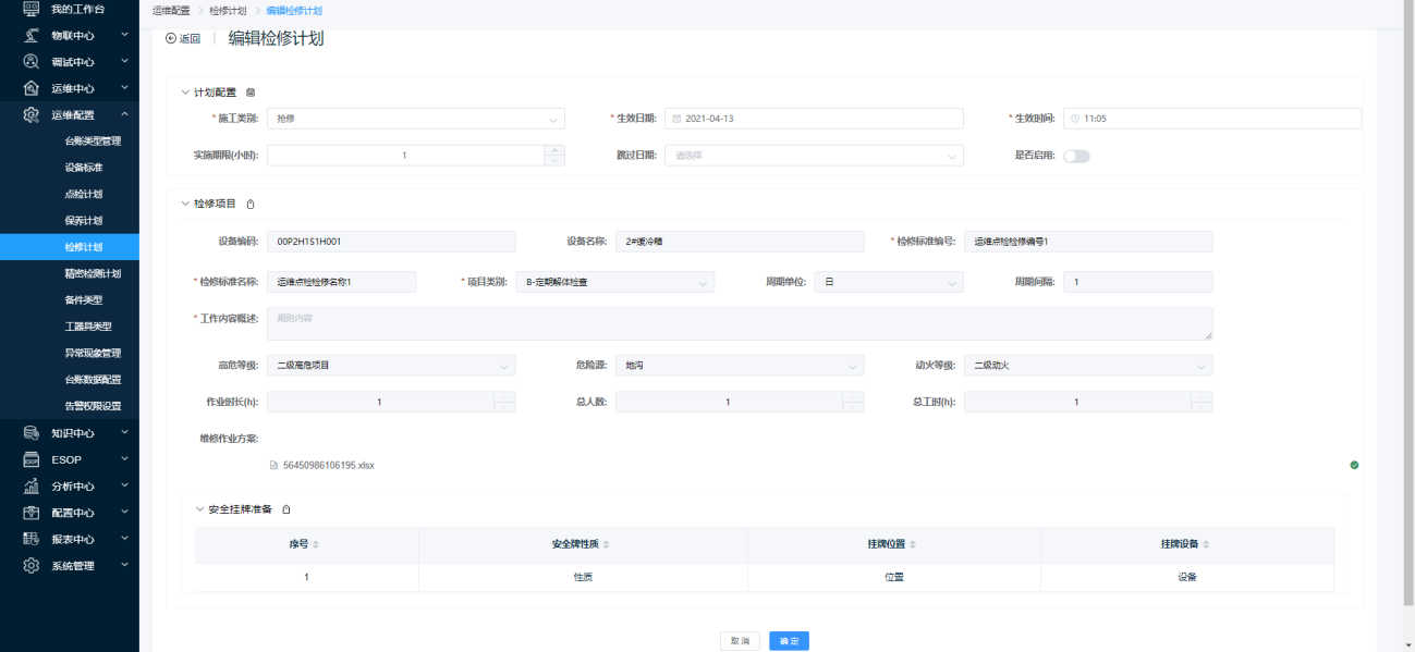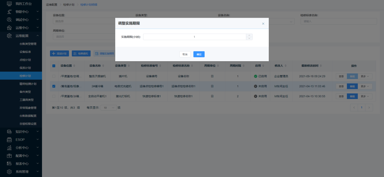 选择需要编辑的检修计划点击【编辑】按钮,在跳转后的页面中更改完计划配置后,点击【确定】保存更改后的检修计划。