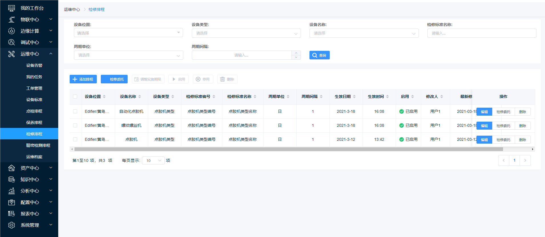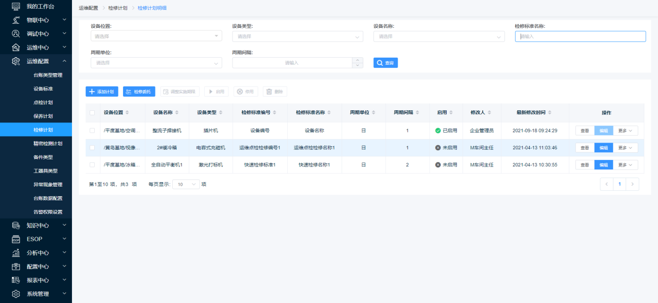 用户能够在指定的区域进行检修计划的编辑,对已添加的检修计划进行管理操作,根据检修计划名称进行数据查询,进行编辑、删除、停用、启用等操作。