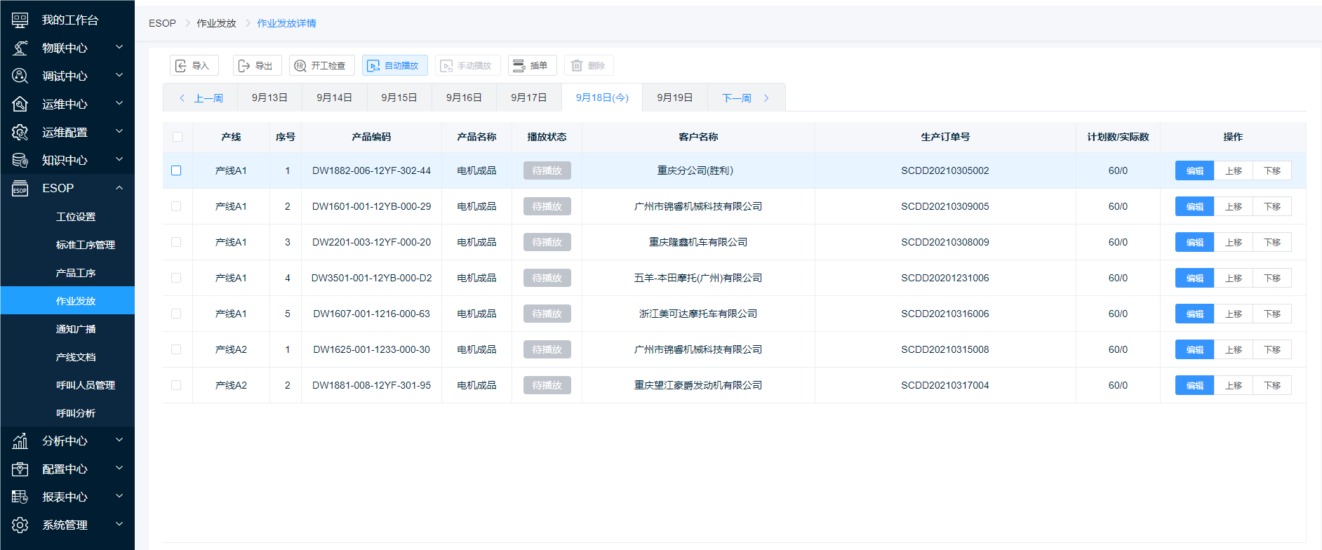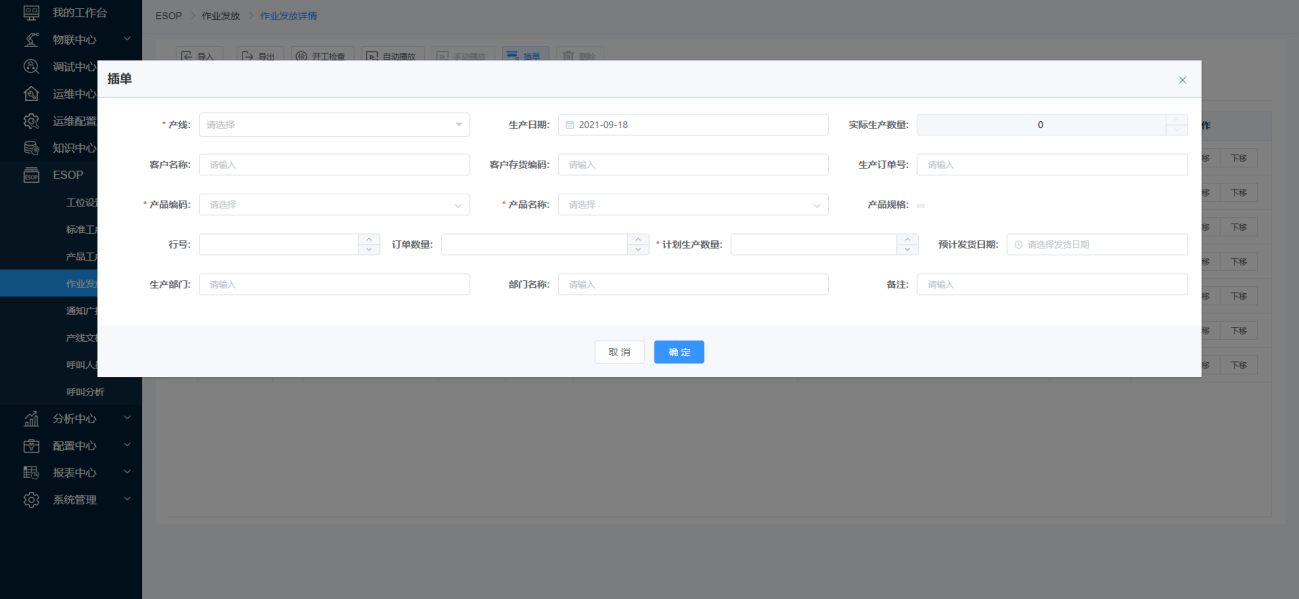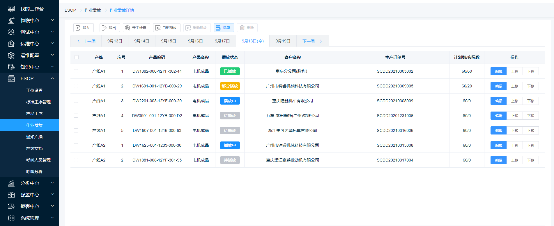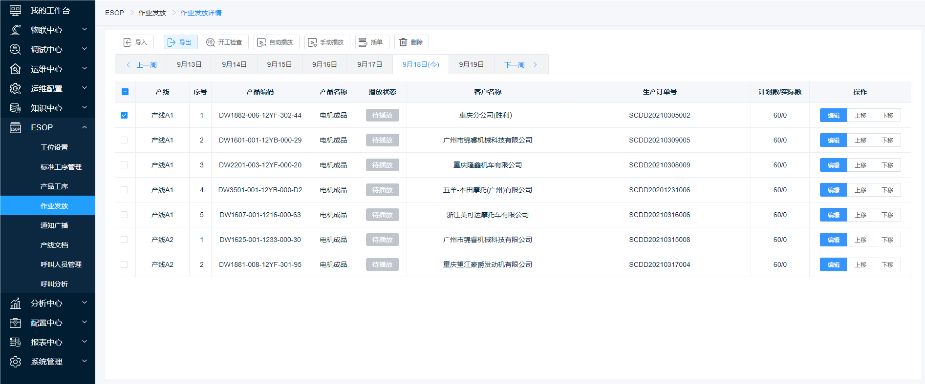 作业发放模块用以导入生产订单,并发送产品工序,用户可在此模块对订单进行编辑、导入、导出、插单、删除、修改数量的操作。