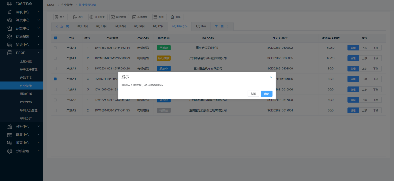 选择状态为‘部分播放’、‘待播放’的订单点击【手动播放】按钮,该订单状态变为‘播放中’,对应工位看板播放切单的产品工序,前订单有未完成生产数,状态变为‘部分播放’,订单数已完成后,状态变为‘已播放’。