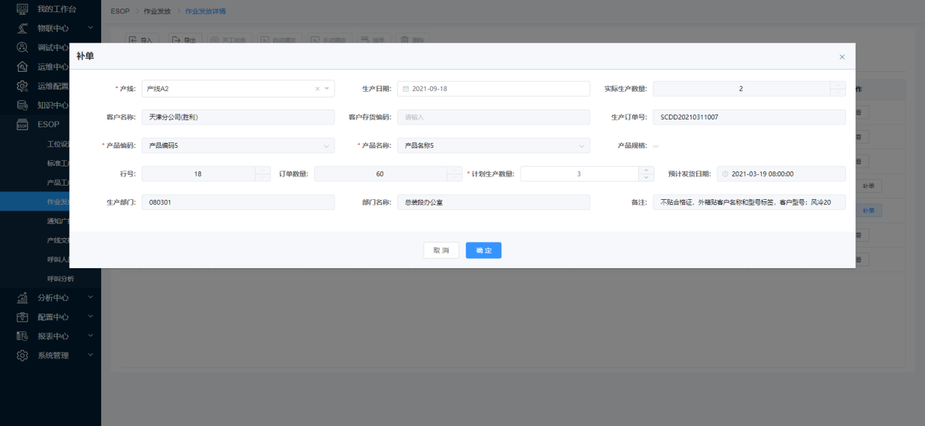 第二步:在弹出【补单】窗口配置补单数量,选择补单产线,点击【确定】,即可在今日选中产线下增加一条新订单。