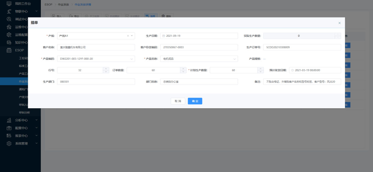 第二步:在弹出【插单】窗口配置订单数据,点击【确定】,即可在选中订单下进行插单。