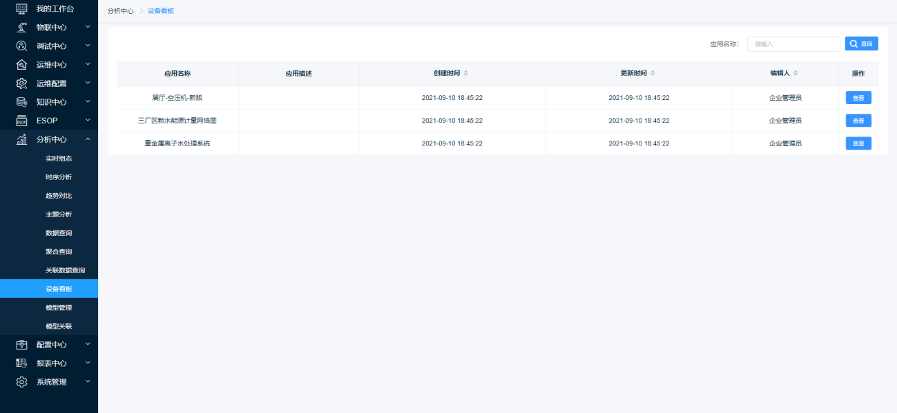 显示该用户能显示的设备看板应用在角色管理中专门对设备看板进行授权,该授权控制设备看板模块的数据权限授权用户登陆进入该模块后,点击“查看”,可跳转对应的看板。