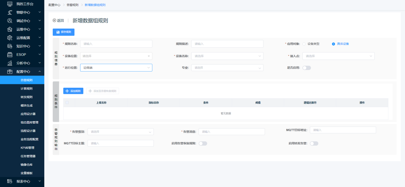 运行位置“边缘端“的数据组规则会同步布边缘同步-告警规则模块,下发后在边缘端校验规则条件并触发告警。选择运行位置在边缘端,转发方式为mqtt。