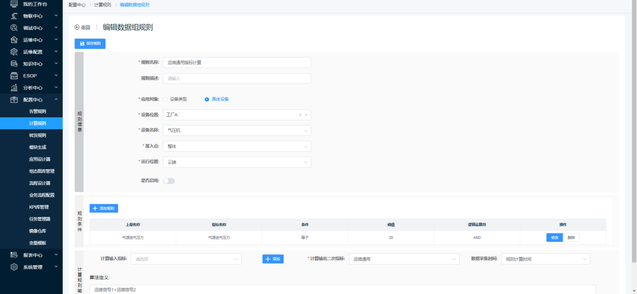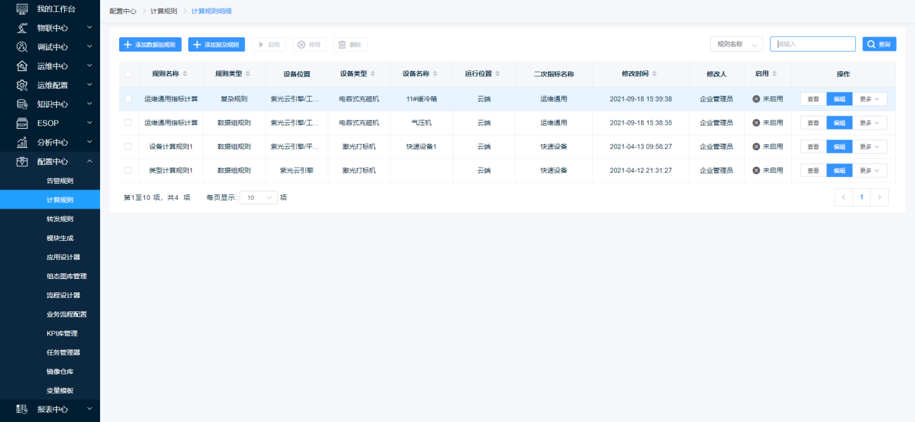 用户能够根据设备与设备类型进行计算的添加,对已添加的计算规则进行管理操作,根据规则名称、设备名称、设备类型对计算规则进行查询,进行查看、编辑、复制、删除、停用、启用等操作。