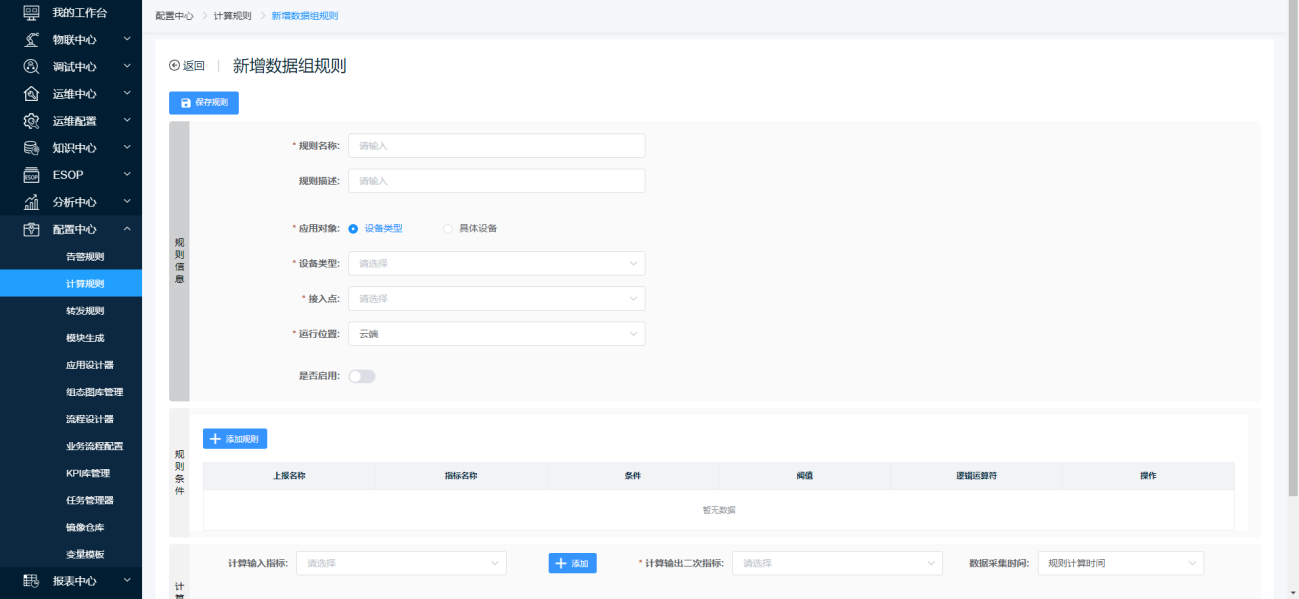 第二步:在跳转后的页面中依次设置规则信息、运行位置、规则条件、计算规则输出、数据采集时间操作点击【保存规则】完成计算规则的添加。