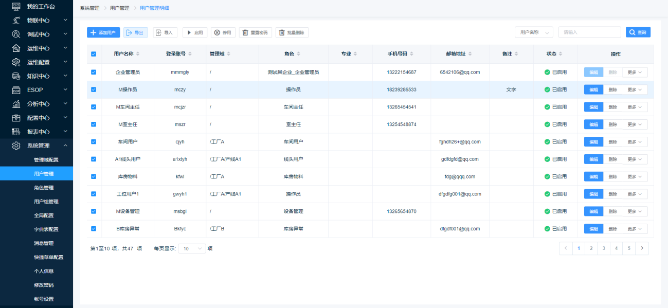 用户管理模块主要是对用户进行管理,管理员可在此模块对用户信息进行添加、删除、编辑、停用、启用、角色分配、重置密码、关联设备类型、查询操作。