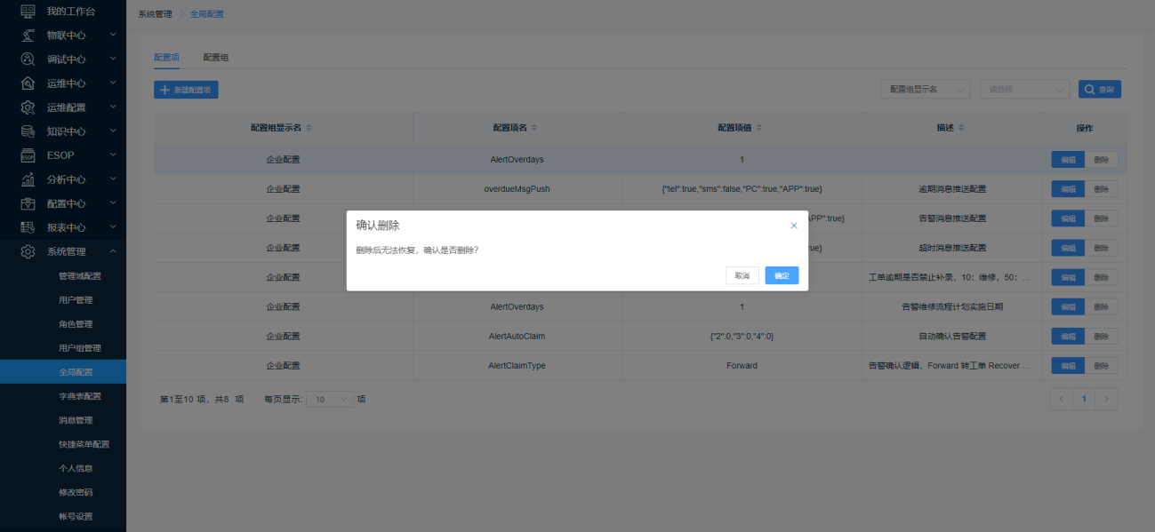 选择需要删除的配置项点击【删除】按钮,在弹出的【提示】对话框中点击【确定】按钮删除配置项