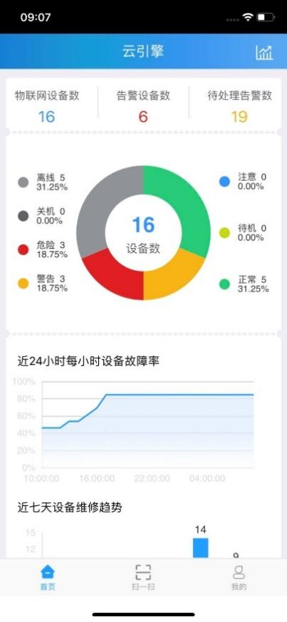管理员首页显示企业相关统计指标,设备状态统计、设备故障率趋势统计、设备维修趋势统计、告警设备统计。