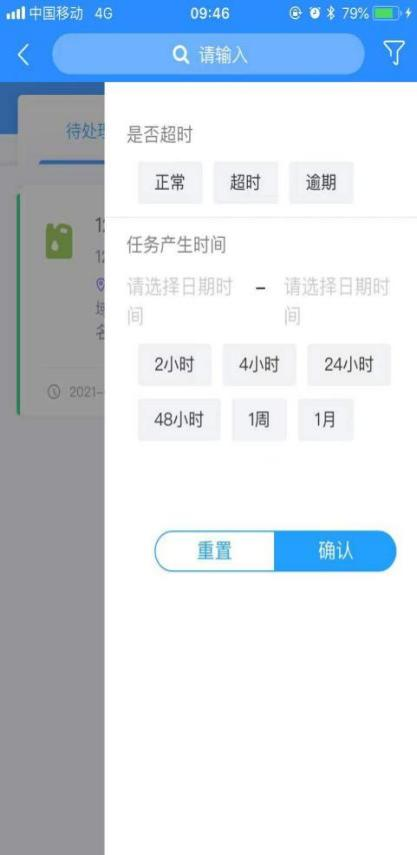 点击【筛选】展开查询条件页,选择查询条件:是否超时、任务产生时间进行任务筛选