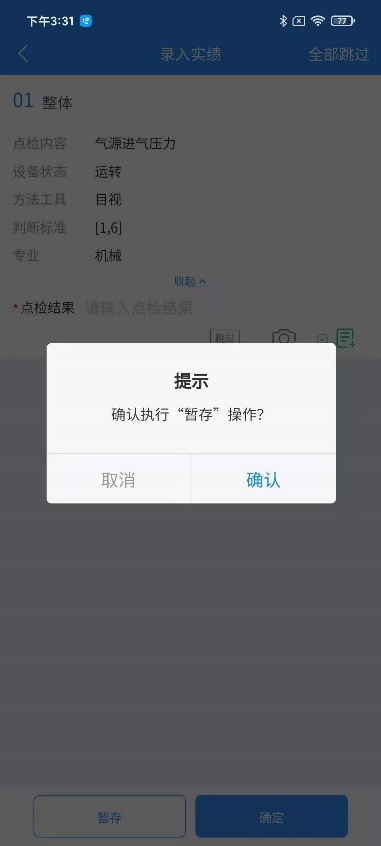 如遇特殊情况,无法一次录入全部项次时,可点击【暂存】,执行暂存操作,再次进入该任务录入实绩时,可保留原点检数据继续录入。