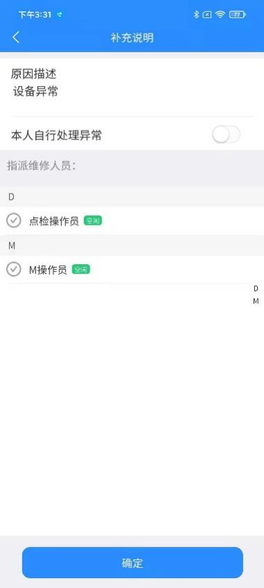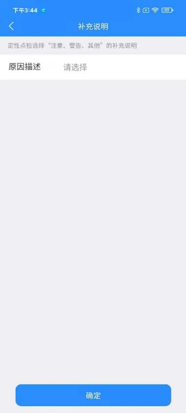定量点检超过判断标准范围时,定性点检选择告警级别时,进入补充说明页面,录入或选择原因描述,并指派维修人员,可选择本人自行处理异常,完成点检录入实绩并触发告警,告警消息为对应原因描述,指派维修人员为选择的用户,告警依据为点检中上传的照片。