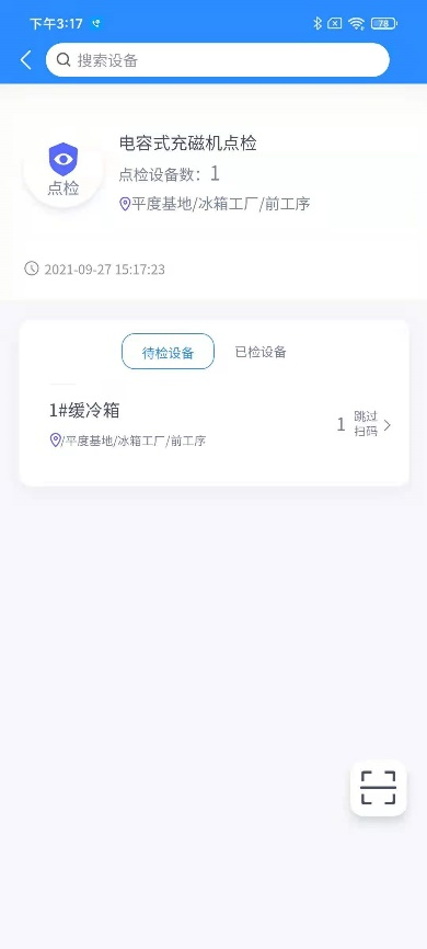 第二步:选择需要处理的点检任务选扫描设备二维码,成功匹配进入录入实绩页面,