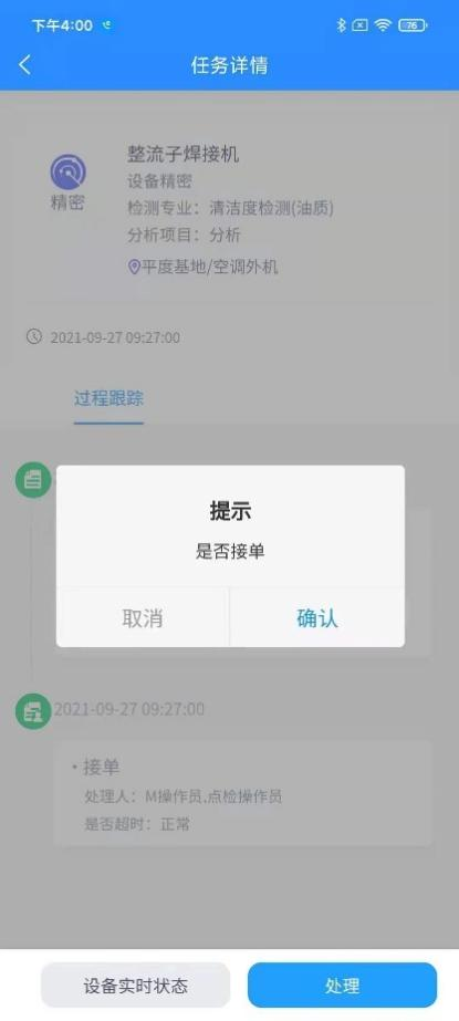 第一步:选择当前处理任务节点为“接单”的任务点击【处理】按钮弹出接单确认窗口页面,点击【确定】按钮完成任务接单。