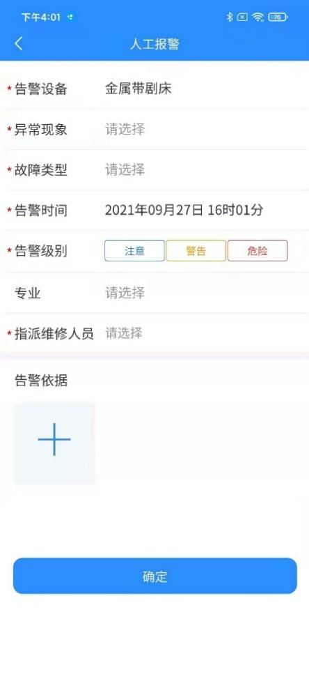 第二步:录入“告警时间”、“异常现象”、 “故障类型”、“告警级别”、 “告警依据”、,点击【确认】按钮完成人工报警的创建。