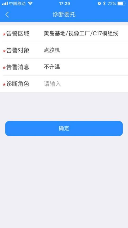 第二步:录入“告警区域”、“告警对象”、“告警消息”、“诊断角色”,点击【确认】按钮完成诊断委托的创建。