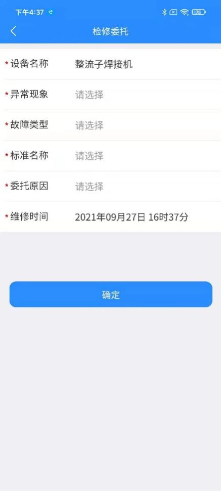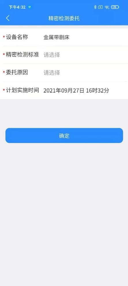 第二步:录入“设备名称”、“检测标准名称”、“委托原因”、“委托时间”,点击【确认】按钮完成精密检测委托的创建。