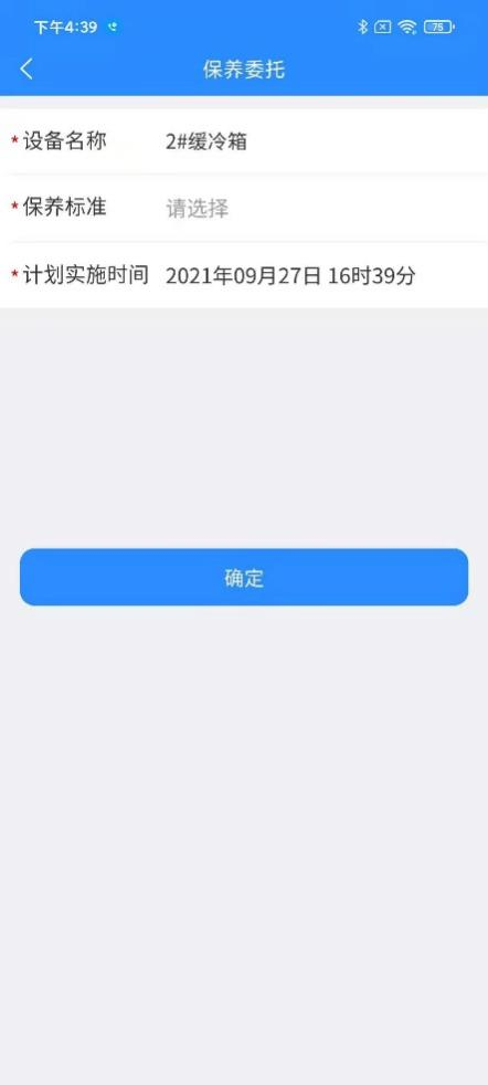 第二步:录入“设备名称”、 “保养标准”、“委托时间”,点击【确认】按钮完成保养委托的创建。