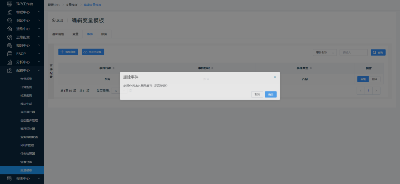 选择需要修改的模板点击【编辑】按钮跳转至【基础属性】页面,即可对当前模板的基础属性、变量编辑、事件、服务。