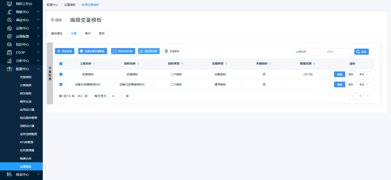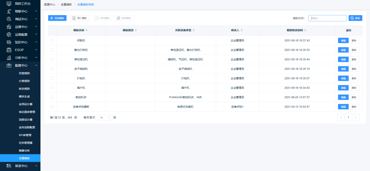 变量模板是每类设备组件共有的数据项的组合,支持对模板进行添加、复制、导入、导出、编辑、删除操作。