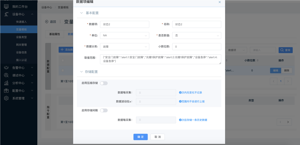 解答:设备所在的【变量模板】中,“状态2”数据项的【数据分类】选择为:“故障”,【取值范围】配置为:{"安全门故障":"alert:1:安全门故障","光栅1保护故障":"alert:2:光栅1保护故障","设备急停":"alert:4:设备急停"};